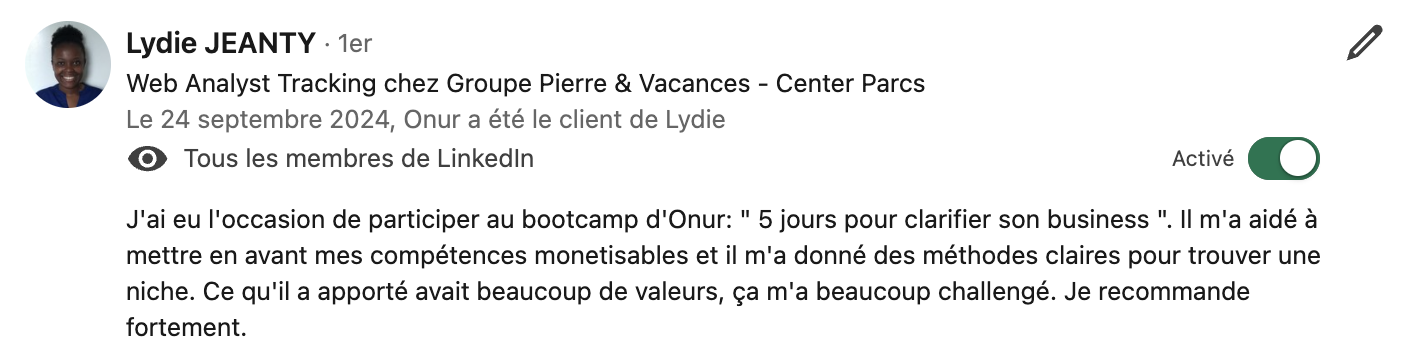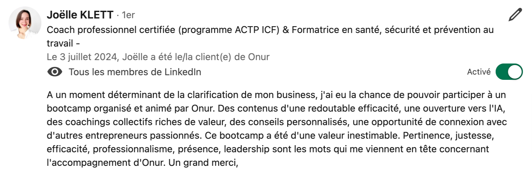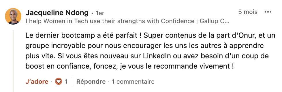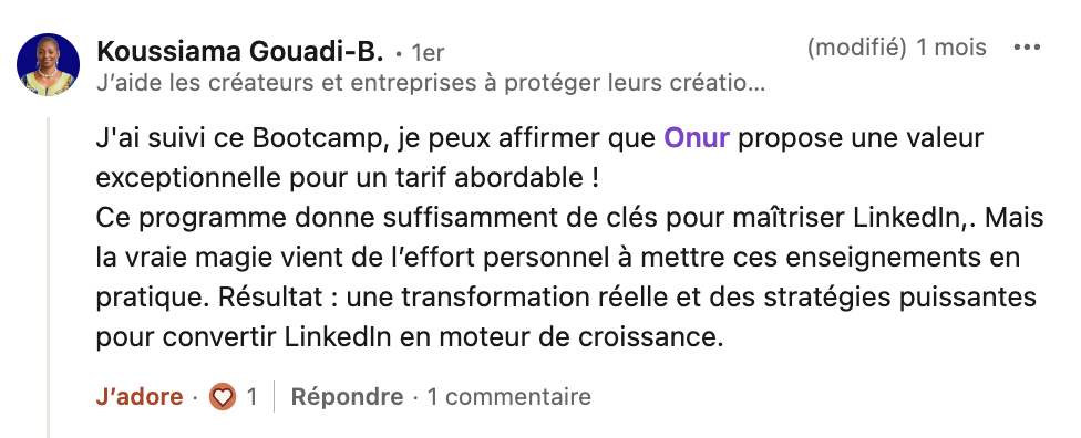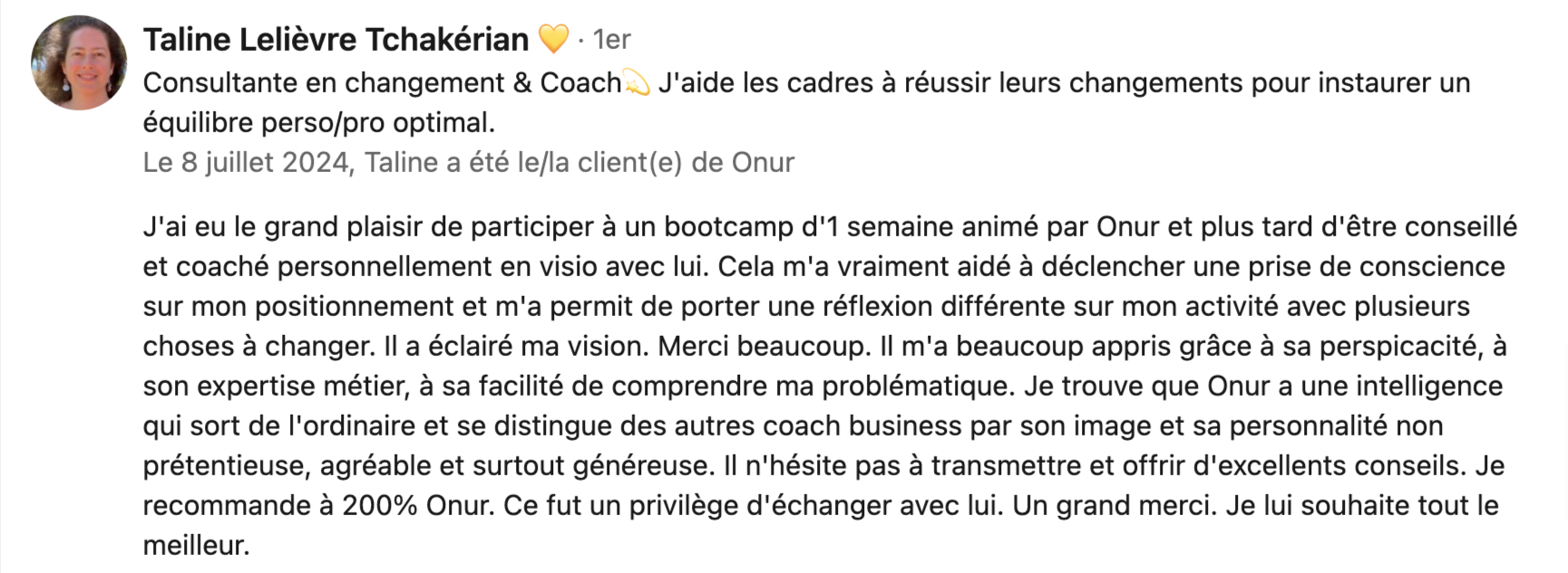 "Grâce au Bootcamp d’Onur, j’ai appris à structurer mes posts, optimiser mon profil et vendre naturellement, tout en restant pleinement authentique. Les conseils concrets et l’entraide du groupe m’ont permis d’avancer vite, avec plaisir. Résultat : plus d’engagement, de vrais échanges, et une stratégie claire."