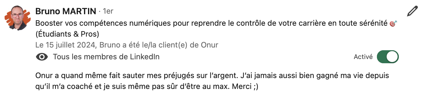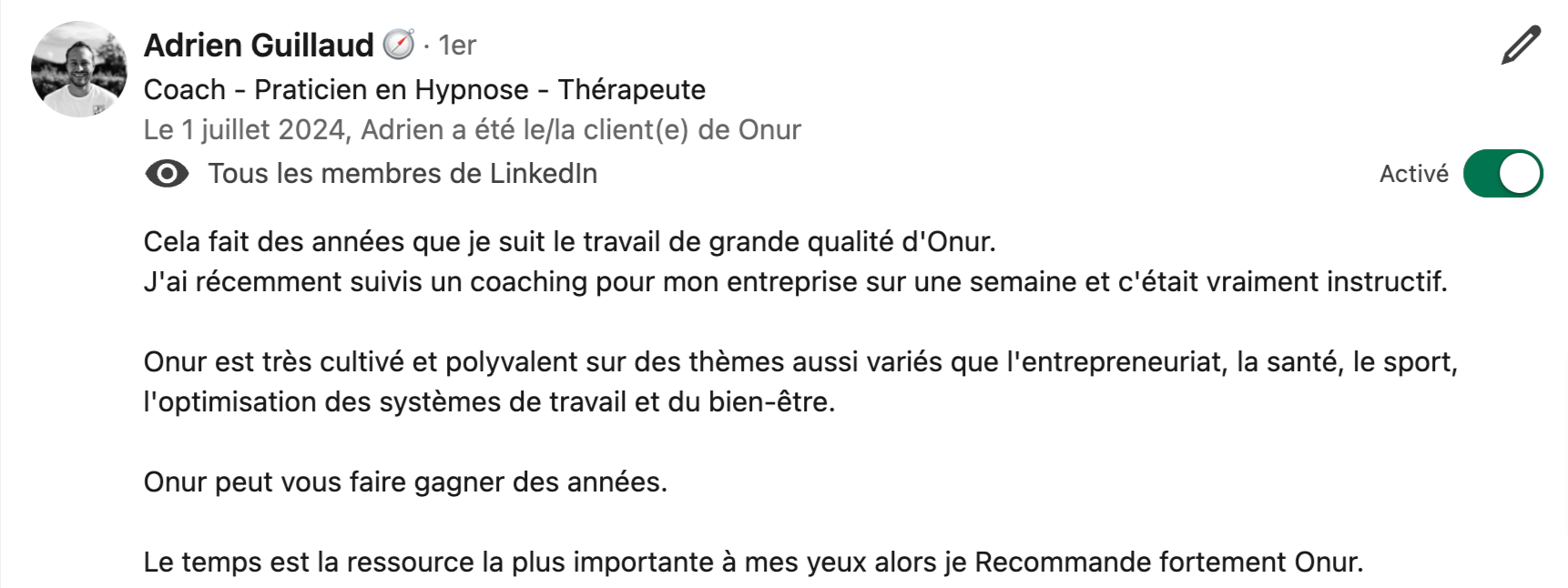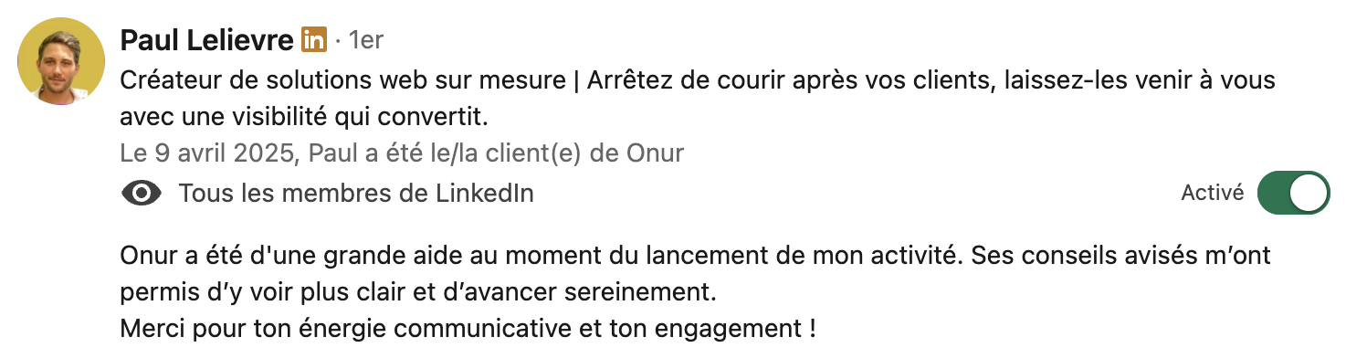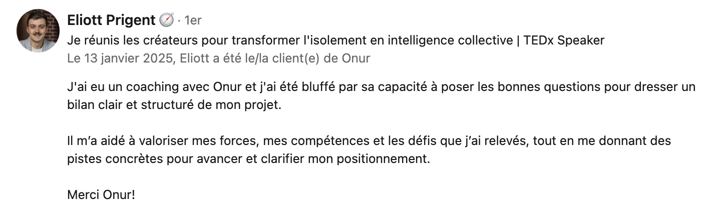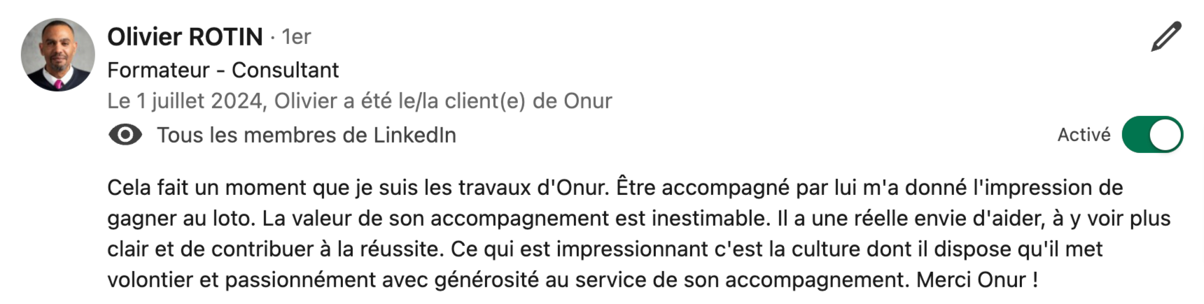 "Après plusieurs années sur LinkedIn, il me manquait une vraie méthode. Avec Onur, j’ai appris à structurer mon profil, rédiger des posts impactants et mieux interagir avec mon réseau. Résultat immédiat : plus d’engagement, plus de visibilité et surtout, de nouveaux prospects qui viennent directement à moi. Un vrai déclic !"