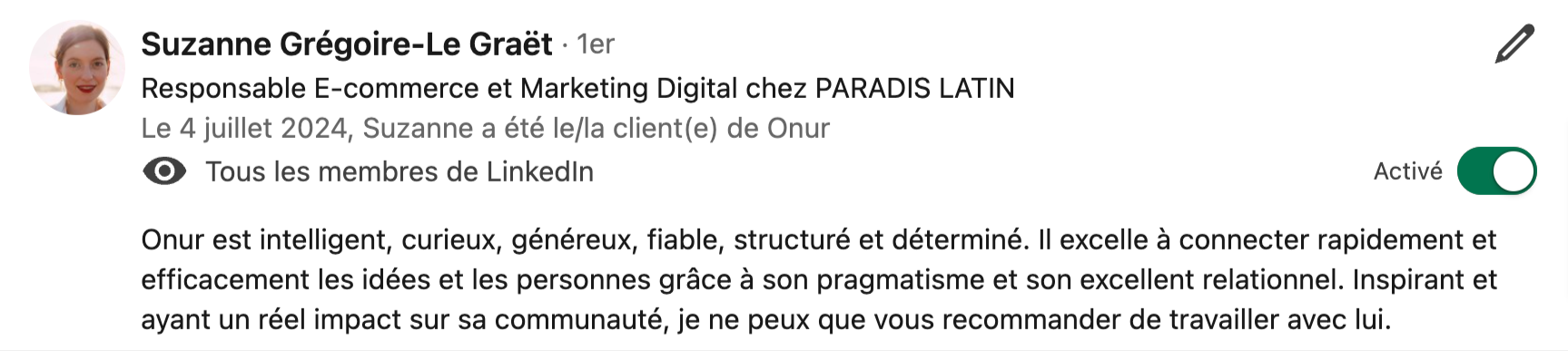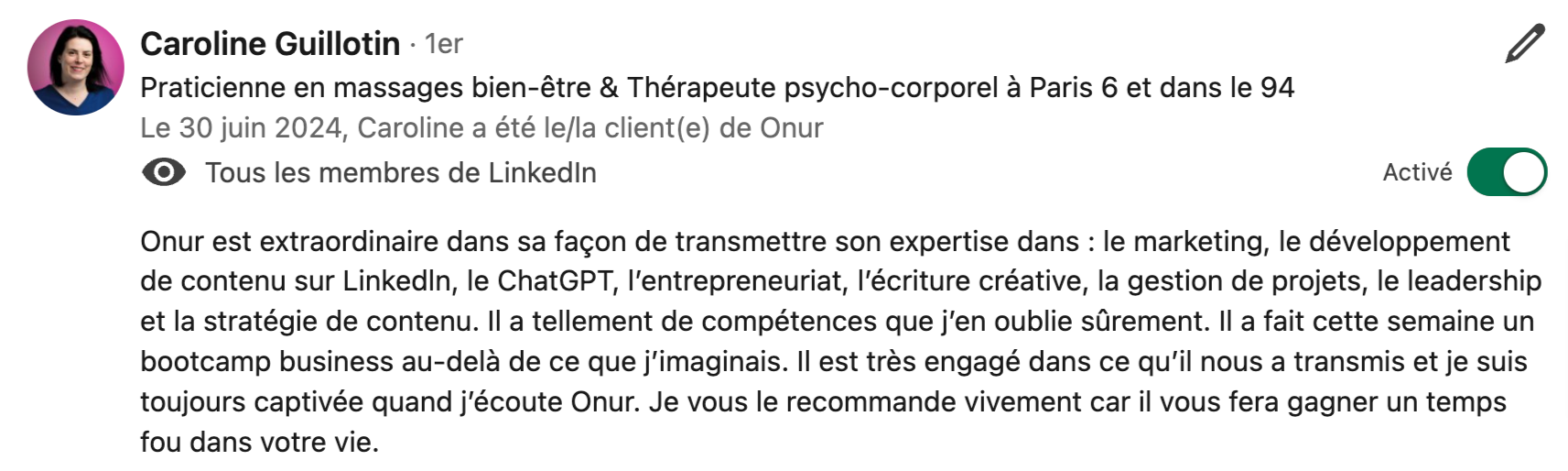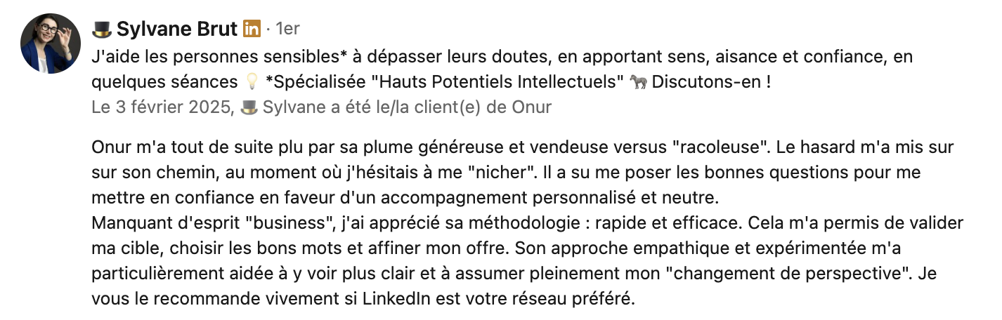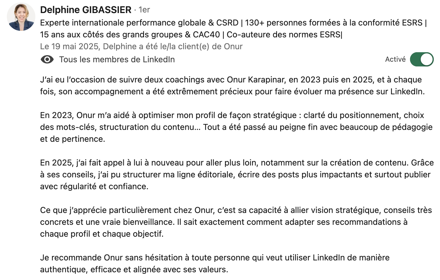 "Après plusieurs années sur LinkedIn, il me manquait une vraie méthode. Avec Onur, j’ai appris à structurer mon profil, rédiger des posts impactants et mieux interagir avec mon réseau. Résultat immédiat : plus d’engagement, plus de visibilité et surtout, de nouveaux prospects qui viennent directement à moi. Un vrai déclic !"