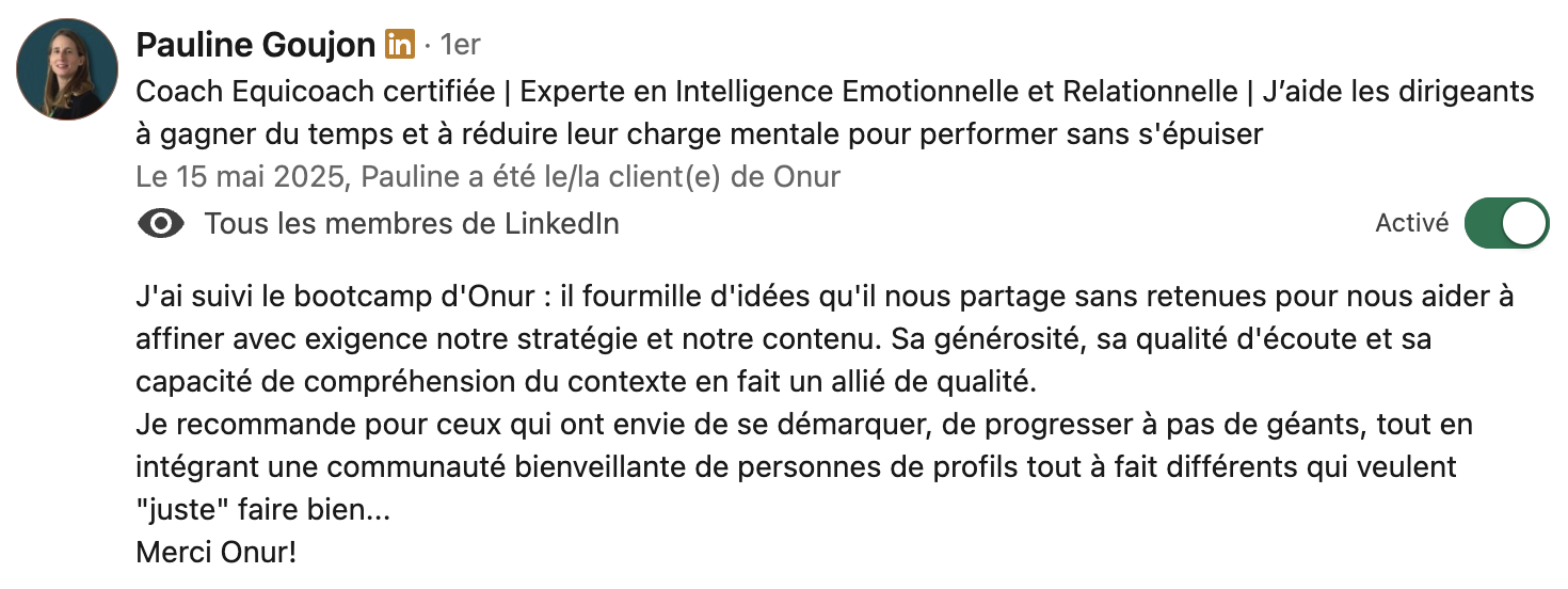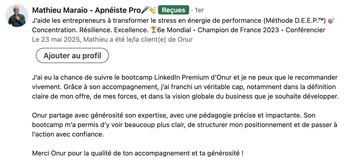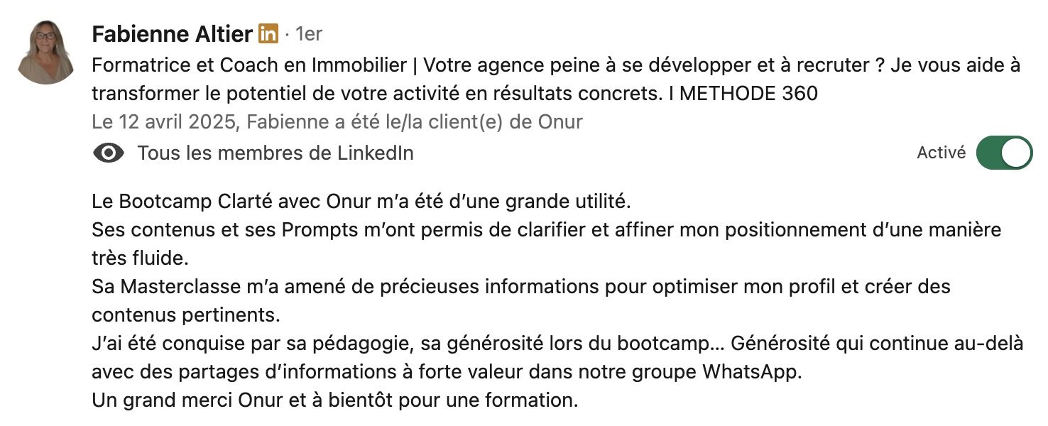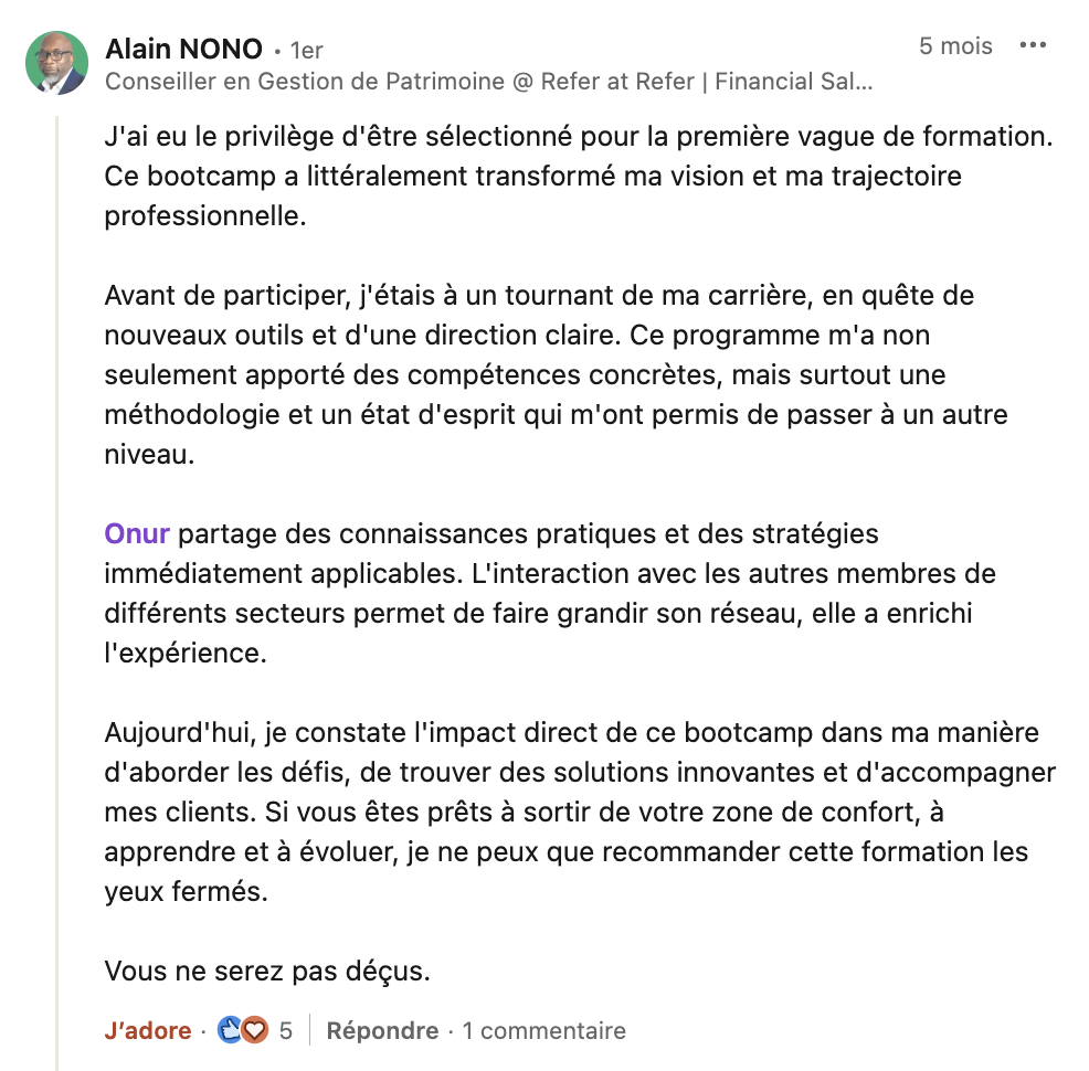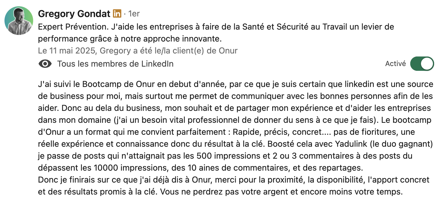 "Avant le Bootcamp d’Onur, malgré mes 25 000 abonnés LinkedIn, j’avais peu d’engagement et aucune vente. Grâce à sa méthode concrète et ses analyses en temps réel, j’ai enfin compris comment créer des publications qui cartonnent. Résultat : une visibilité multipliée par 30 en quelques semaines !"