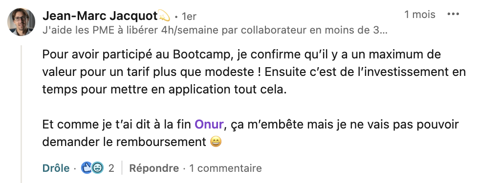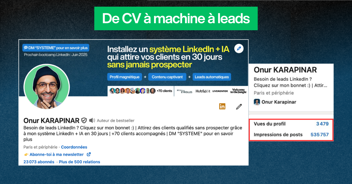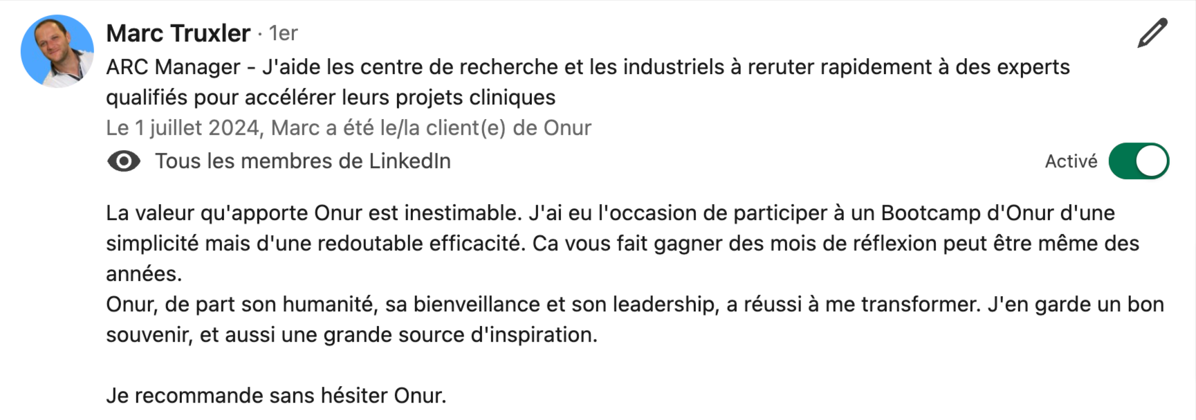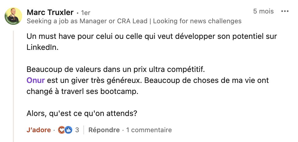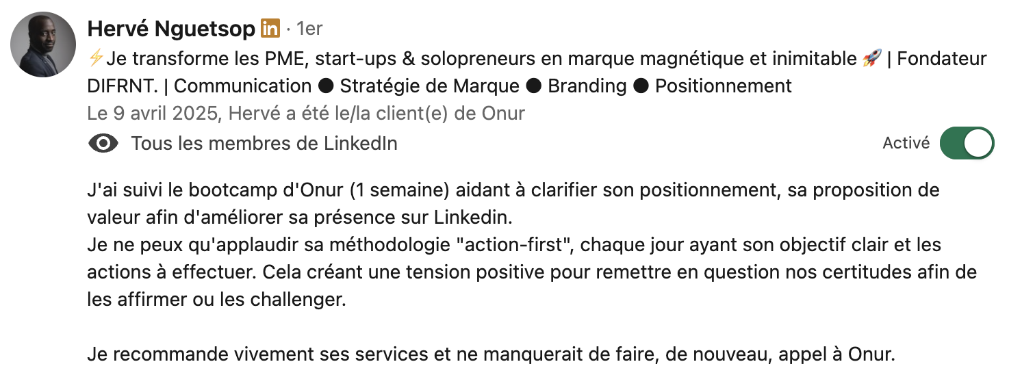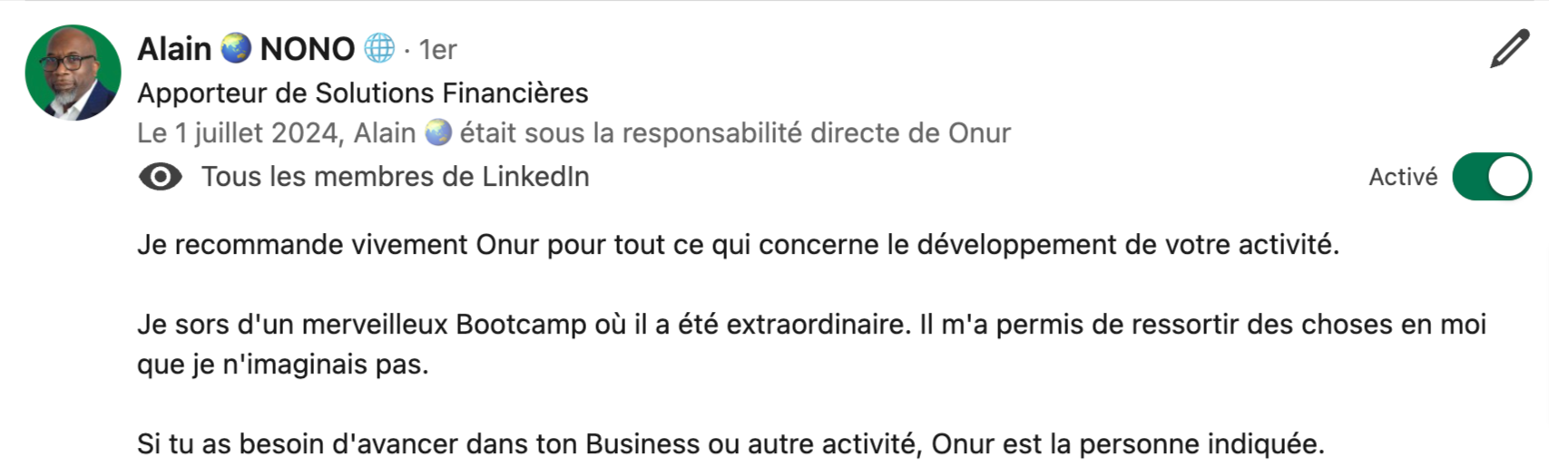 "Avant le Bootcamp d’Onur, malgré mes 25 000 abonnés LinkedIn, j’avais peu d’engagement et aucune vente. Grâce à sa méthode concrète et ses analyses en temps réel, j’ai enfin compris comment créer des publications qui cartonnent. Résultat : une visibilité multipliée par 30 en quelques semaines !"