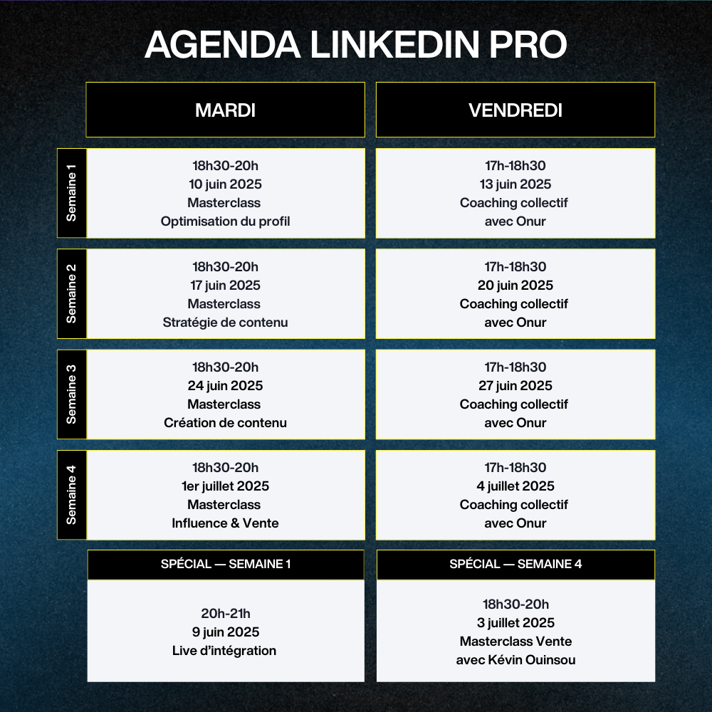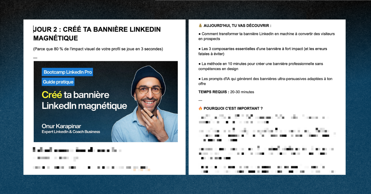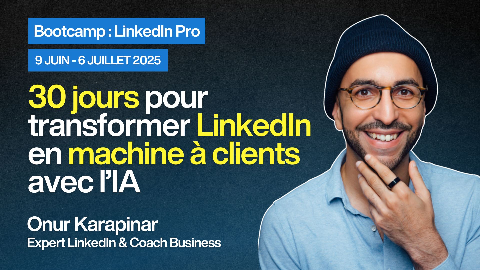 Le Bootcamp LinkedIn Pro, c’est 30 jours pour structurer votre présence, attirer des clients et faire de LinkedIn une vraie machine à opportunités.